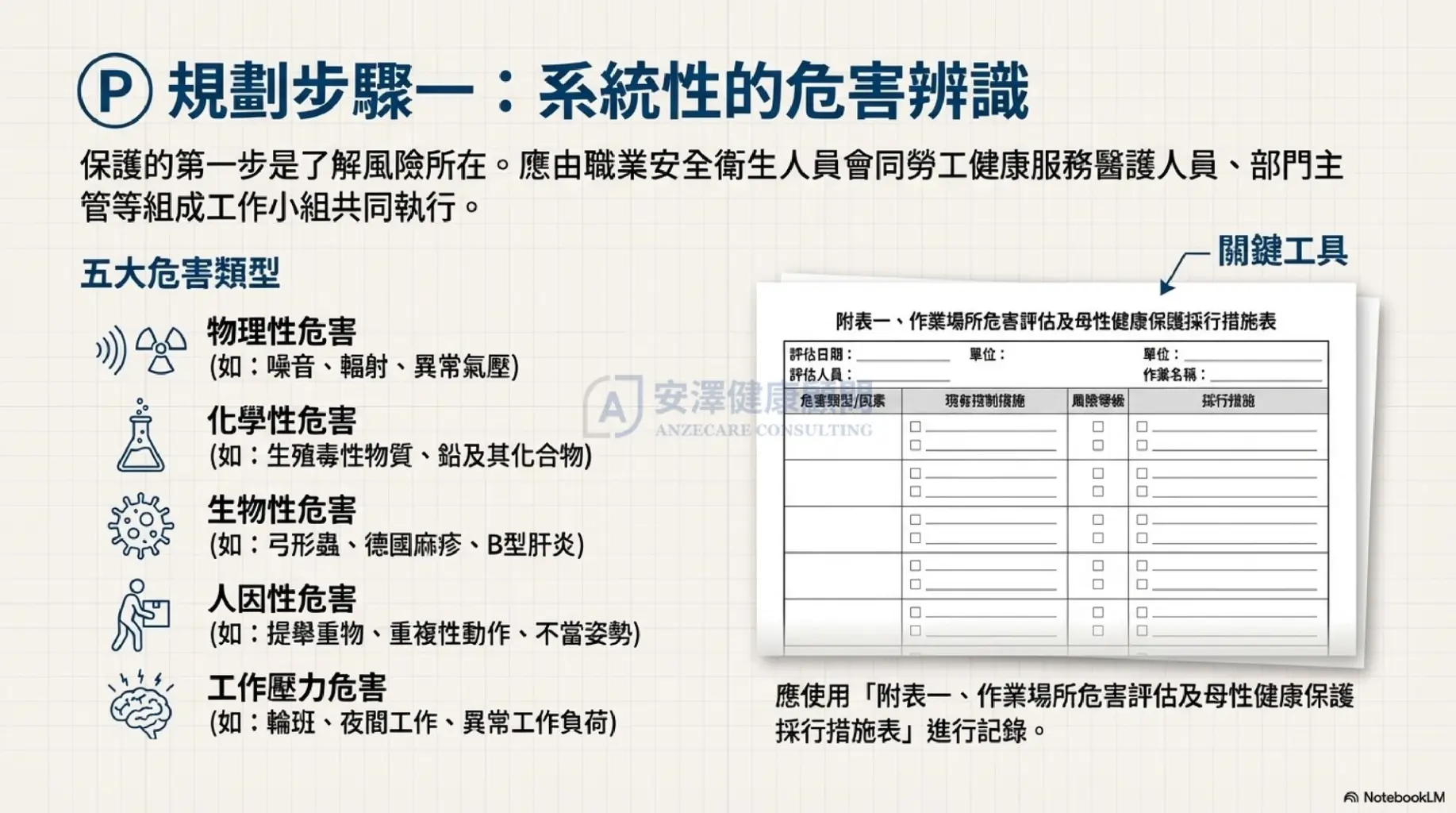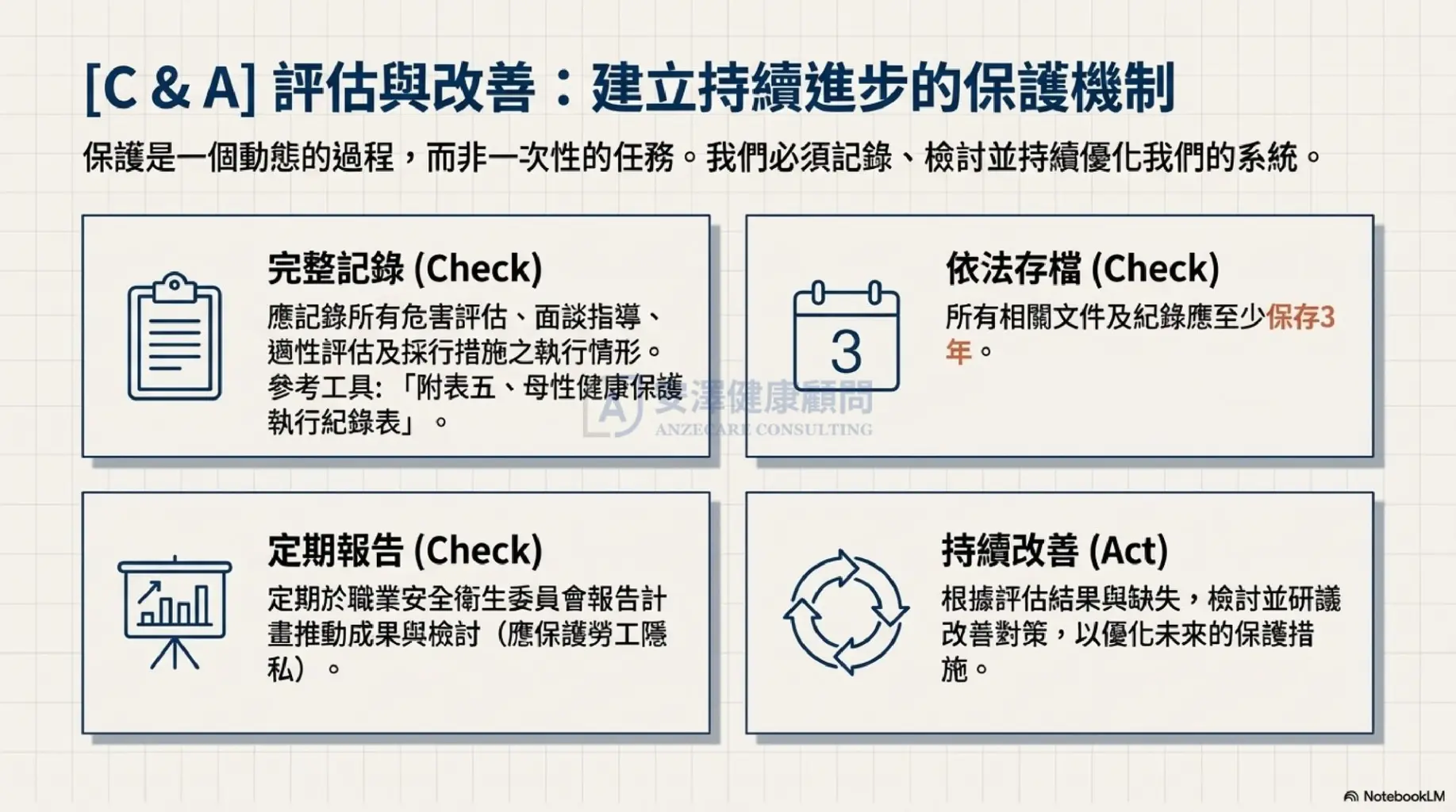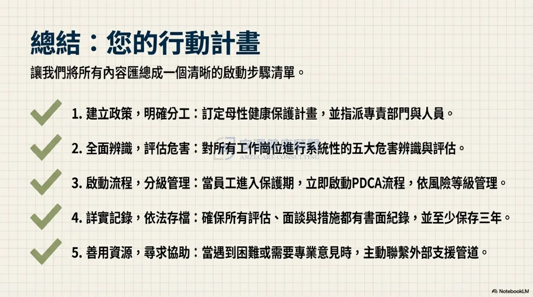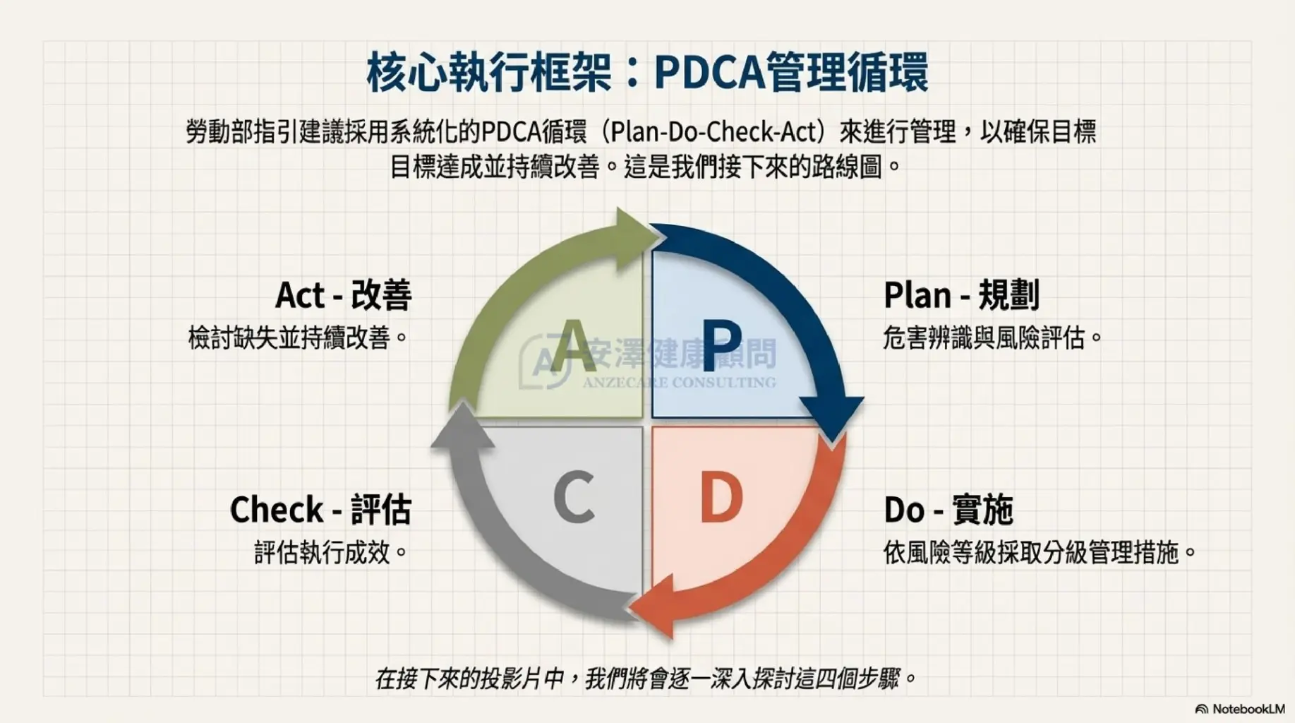為了協助企業從容應對,安澤健康顧問 根據勞動部最新版指引,將複雜流程簡化為 5 個可執行的 PDCA 步驟: