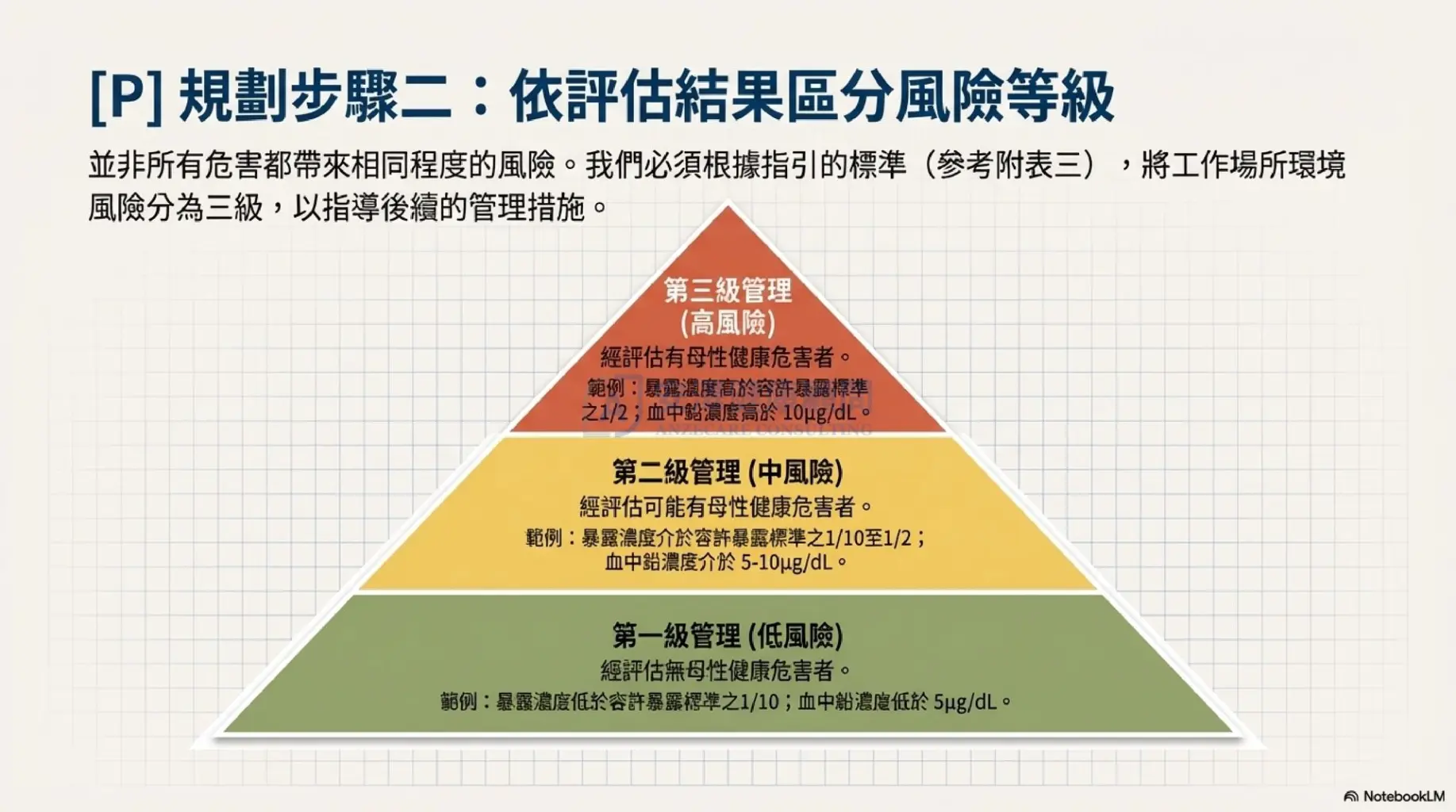 第三級(高風險):如暴露濃度超標,需立即改善或調整工作 。