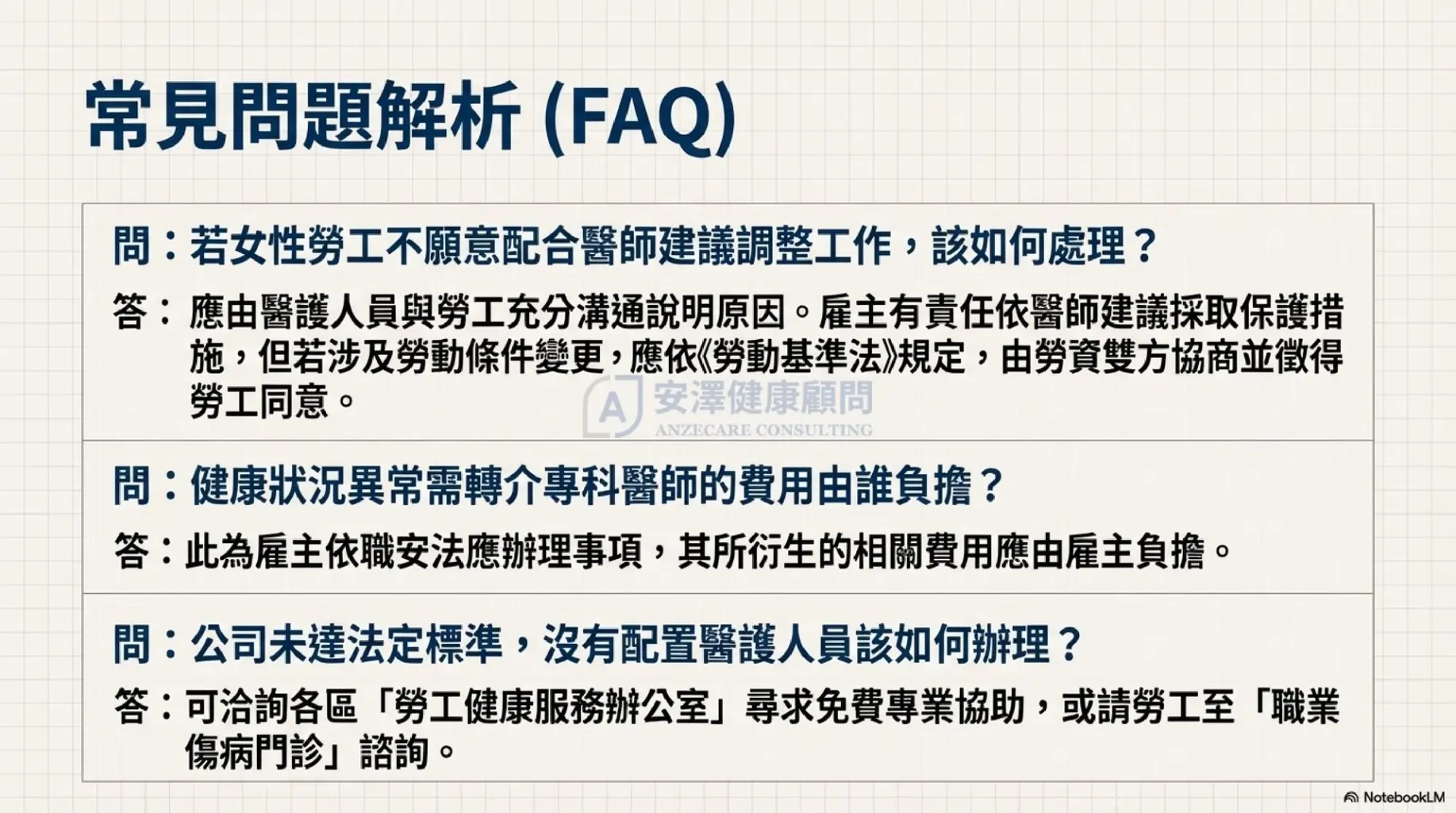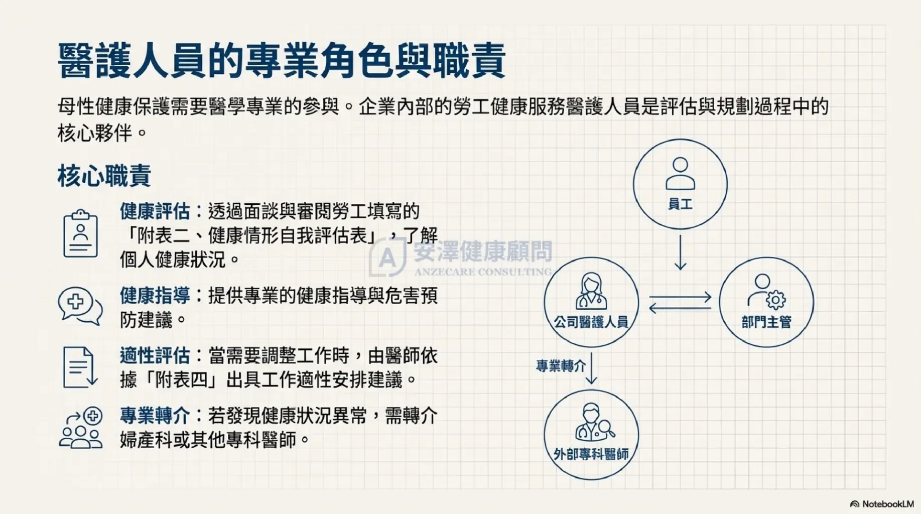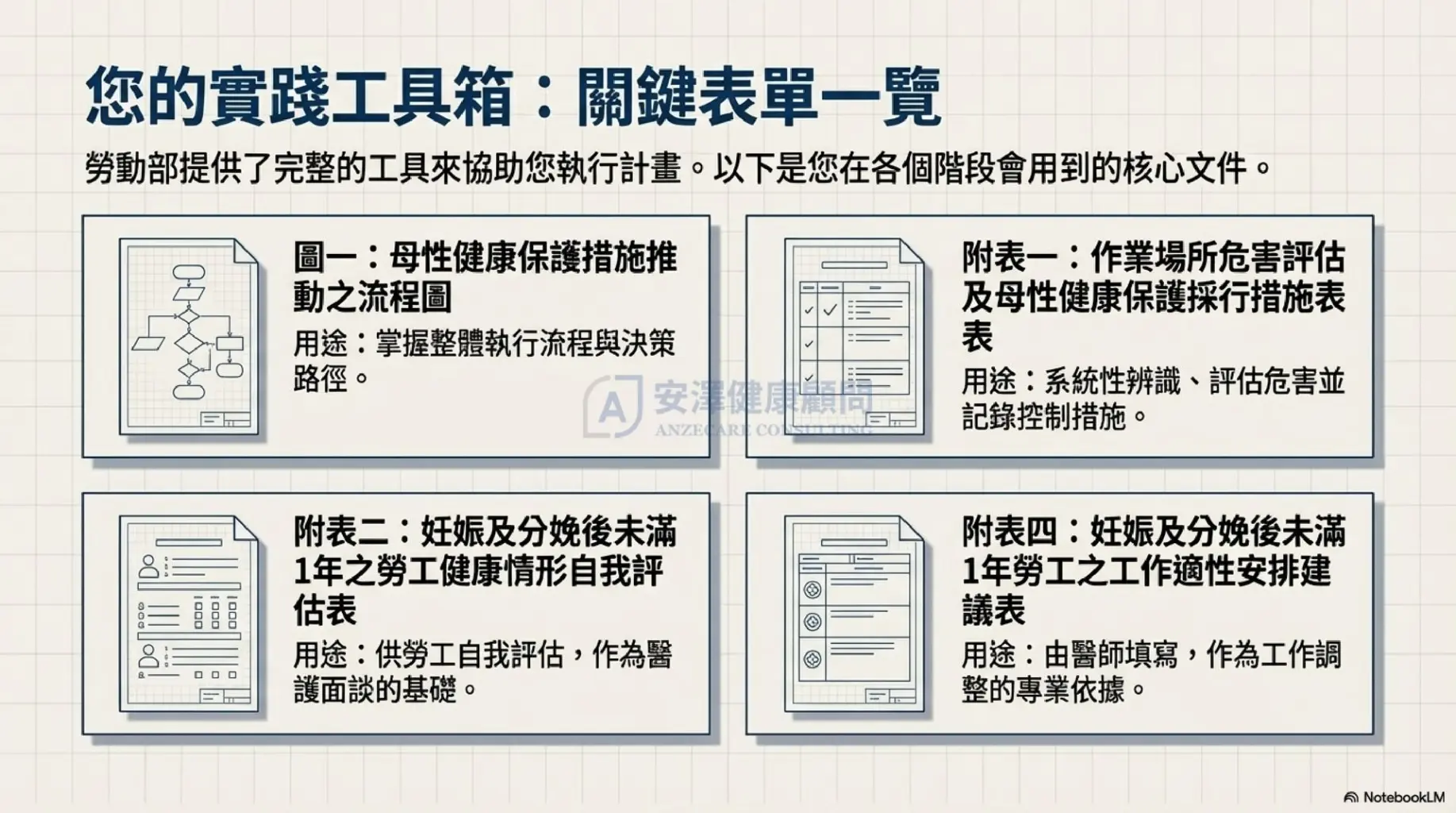 面對繁雜的風險評估表單感到頭痛?不確定如何與懷孕員工進行適性面談? 安澤健康顧問 提供從危害辨識到醫師臨場服務的一站式解決方案,協助您輕鬆符合法規,讓員工安心工作。