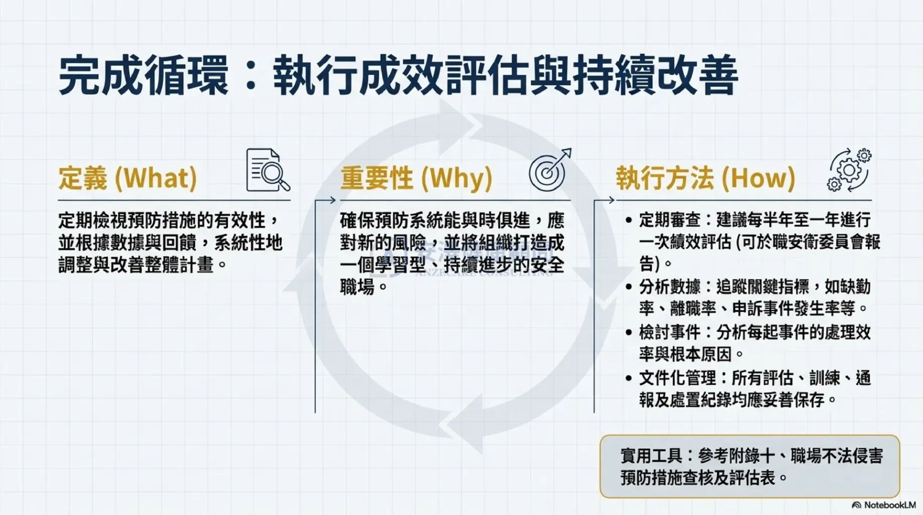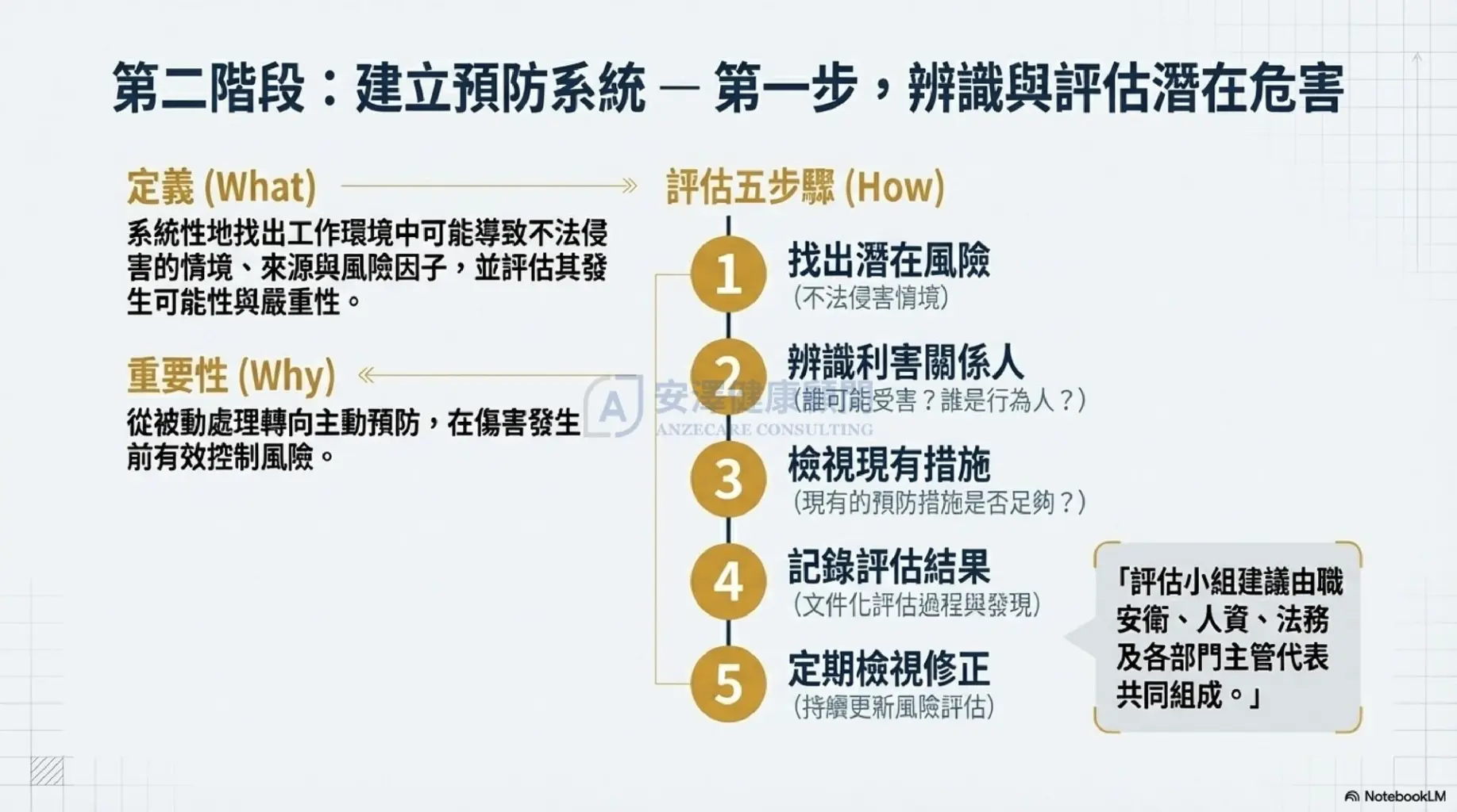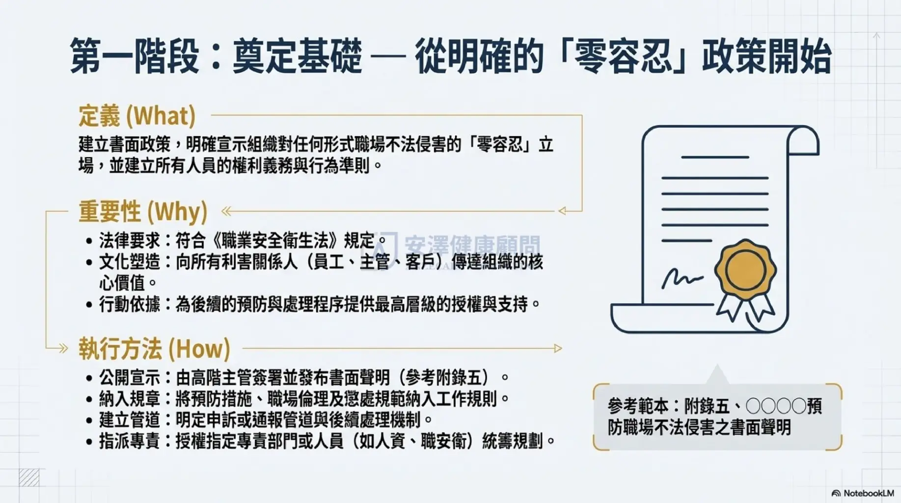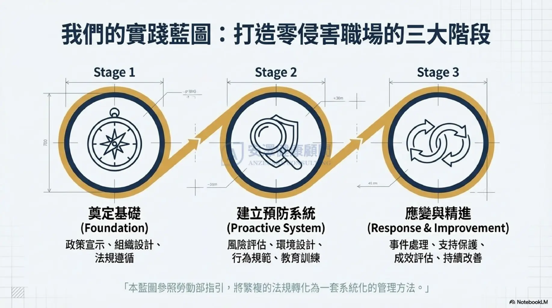 為了將繁複的法規轉化為可執行的策略,安澤健康顧問 依據勞動部指引,為企業整理出系統化的 3 階段實踐藍圖: