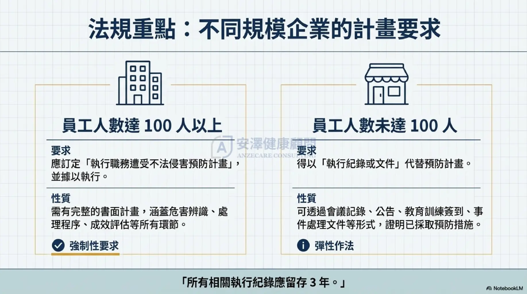 員工人數未達 100 人:雖然不強制訂定完整計畫,但仍得以「執行紀錄或文件」代替,證明已採取預防措施,且相關紀錄需留存 3 年 。