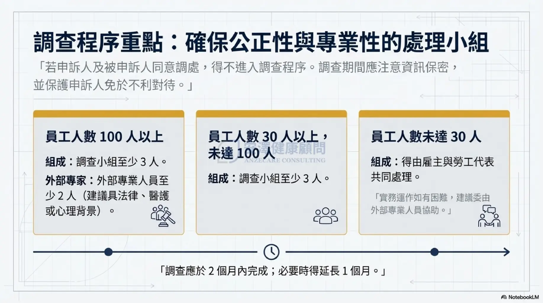 調查與處置:調查應確保客觀公正,原則上於 2 個月內完成。對於申訴人應提供立即性保護(如調整職務),避免二次傷害 。