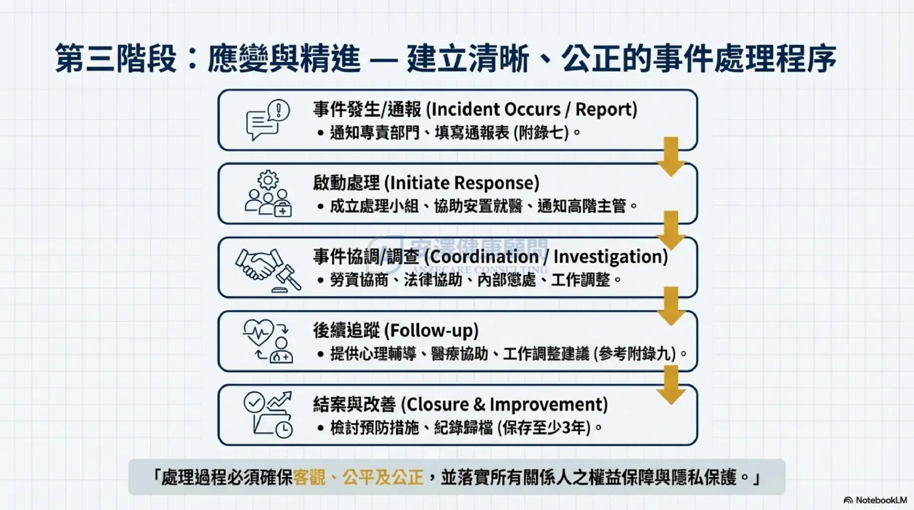 當事件發生時,一套清晰、公正的處理程序是避免爭議的關鍵: