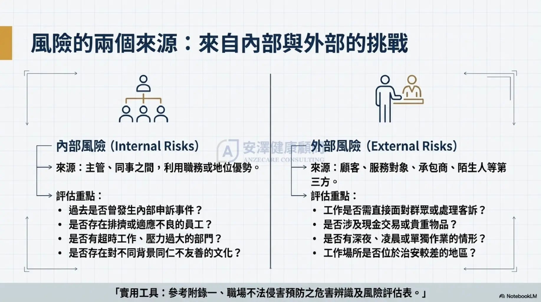 不知道如何撰寫「預防計畫書」?需要外部專家協助進行中立調查? 安澤健康顧問 具備法律與職安衛雙重專業,能協助您從零開始建立不法侵害預防機制,或擔任外部獨立調查委員,保障勞資雙方權益。