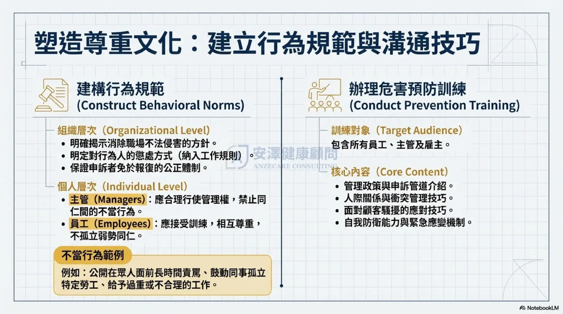 一切從「零容忍」開始。 企業必須由高階主管簽署並發布書面聲明,明確宣示組織對任何形式職場不法侵害(包含霸凌、騷擾、暴力)的零容忍立場。這不僅是法規要求,更是塑造組織文化的核心 。